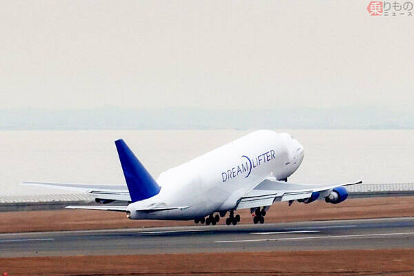 中部空港を離陸するボーイング747-400LCF「ドリームリフター」(2020年2月、乗りものニュース編集部撮影)。