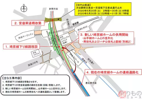 JR渋谷駅の線路切替工事の概要(画像:JR東日本)。