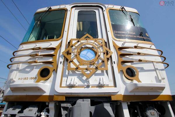 車両は既存のキハ185系ディーゼルカー2両を改造しました。コンセプトは「文明開化ロマンティシズム」。車両の前面は、太陽、船の舵、坂本家(龍馬)の家紋を模した「組あい角」、「時代(トキ)」を刻む時計をモチーフにしたヘッドマークがあしらわれます。