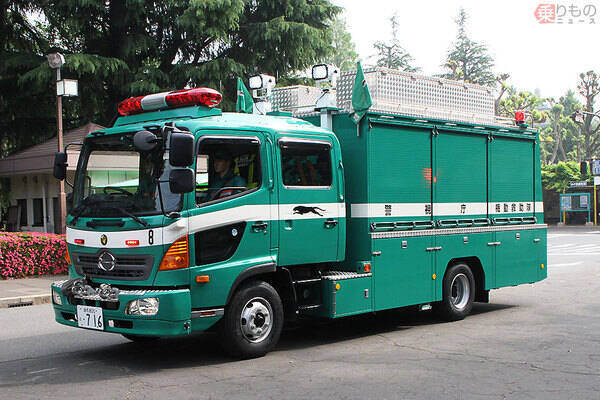警視庁の機動救助隊は、警察の緊急通報番号である「110番」から、「レスキュー110」と通称され、大規模災害だけでなく、平素から水難救助や山岳救助にも従事しています。そのため、警視庁独自の水難救助車や山岳救助車なども保有しており、これらも緑色主体の塗装が施されています。
