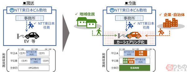 NTT東日本(東日本電信電話)とNTTル・パルク(エヌ・ティ・ティ・ル・パルク)は2020年5月21日(木)、NTT東日本グループが保有する営業車やビルのスペースを活用したカーシェアリングサービスの提供を開始したと発表しました。