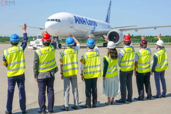 フランクフルトに向かうANAカーゴ「ボーイング777F」を見送る同社のスタッフ(2020年6月10日、乗りものニュース編集部撮影)。