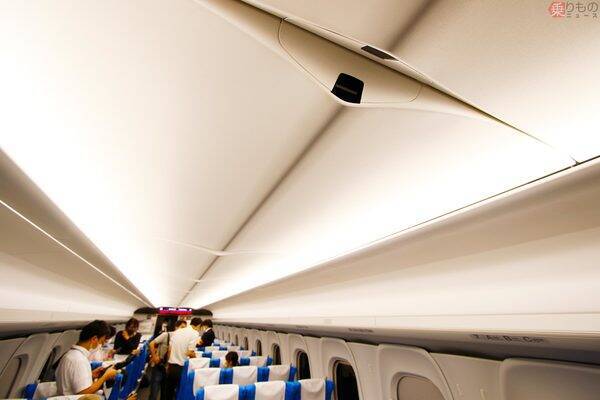JR東海の新型新幹線車両「N700S」。一見すると従来のN700系に似ていますが、天井まわりにもさまざまな進化が見られます。