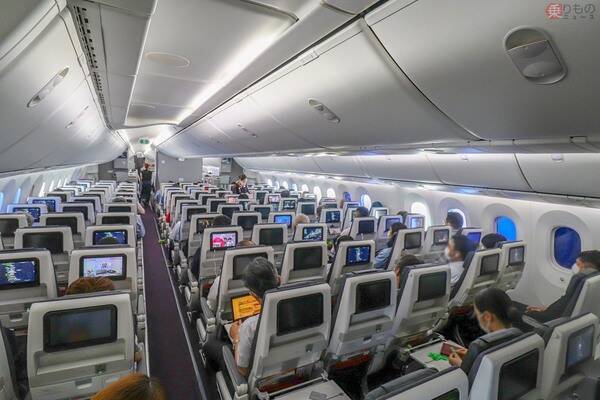 混み具合はどれくらい? ANA国内線とも比較この日のボーイング787型機の機内は、前述のとおり188席が売り出されましたが、乗客数が思いのほか多いことに気づきます。JALによると、この便の搭乗者数は182人で、販売している席のほとんどが埋まっている状態です。離陸前の機内に、新型コロナ対策で機内サービスが一部変更となっていることなどがアナウンスされました。