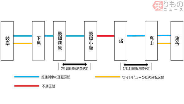 JR東海は2020年7月17日(金)、豪雨で被災し不通になっている高山本線の飛騨萩原~飛騨小坂間と渚~高山間について、18日(土)に運転を再開すると発表しました。