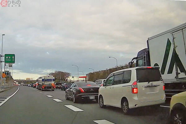 東名上り線、大和トンネルを先頭とした渋滞。綾瀬スマートICの整備により、この渋滞中に一般道へ降りることが可能になる(2019年12月、乗りものニュース編集部撮影)。