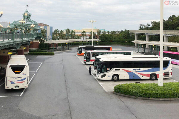 多くの高速バスが発着する東京ディズニーリゾートのバスターミナル。同園もおよそ4か月間の閉園を経て2020年7月に再開した(2019年10月、乗りものニュース編集部撮影)。