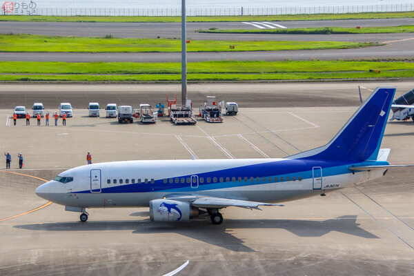ANAグループのボーイング737-500型機は1995(平成7)年に、当時のANK(エアーニッポン。2012年にANAと合併)で導入されたモデルです。短いことから太く見えるその胴体などから「スーパードルフィン」の愛称を持ち、エンジンの側面にイルカのロゴが描かれているのがトレードマークです。北は利尻(北海道)から南は石垣(沖縄県)まで、おもに地方路線で最大25機が運航されていました。