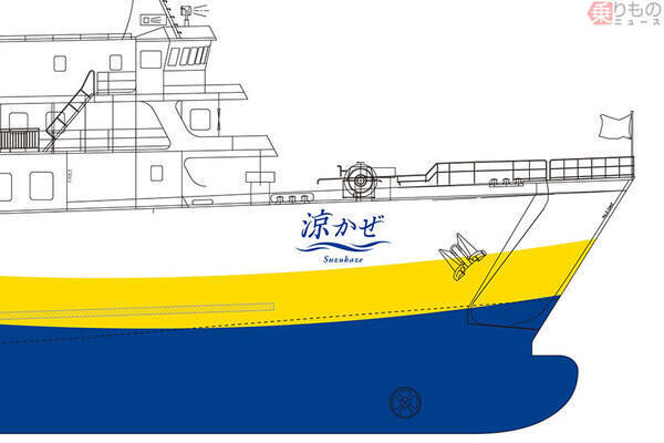 「涼かぜ」は、2021年で就航から20年を迎える「遥かぜ」の代替船です。「遥かぜ」と比べ、総トン数は697トンから1200トンに、全長は71.5mから86.65mに大型化します。