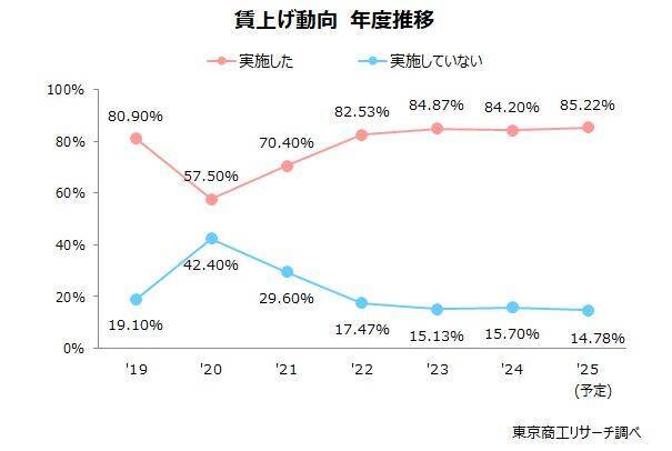 2024年度に賃上げを実施した企業の84.2%を1.0ポイント上回り、調査を開始した2016年度以降では最高を更新する見込みだ。