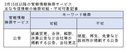 なお、官報情報検索サービスのサービス変更は、ひと足早く3月15日に切り替わる。