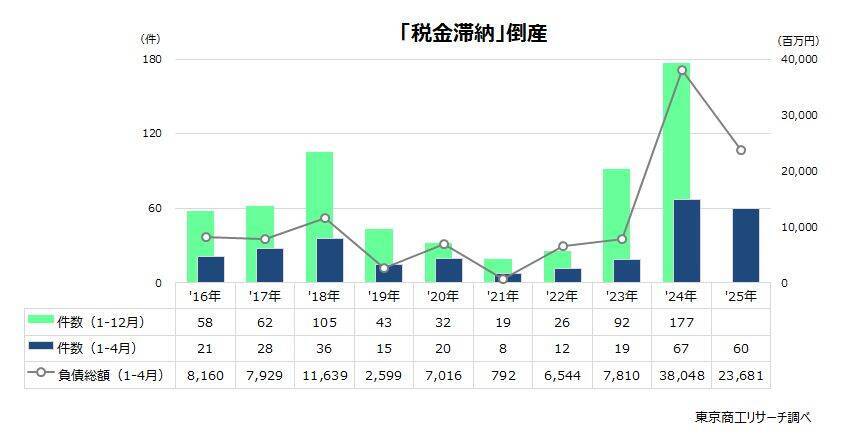 2025年4月の「税金(社会保険料を含む)滞納」倒産は19件(前年同月比9.5%減)で、3カ月連続で前年同月を下回った。この結果、1-4月の累計は60件(前年同期比10.4%減)で、1-4月では4年ぶりに前年同期を下回ったが、2016年以降の10年間では2番目の高水準をたどっている。