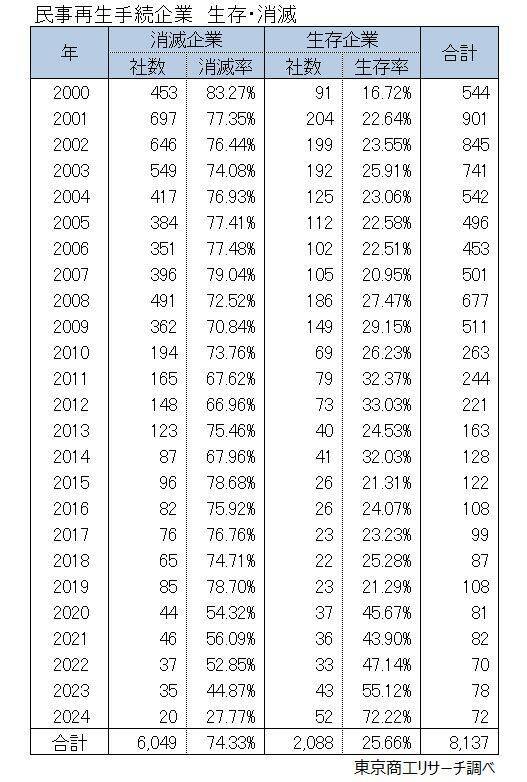 民事再生法の施行25年間で、民事再生法を申請した8,137社のうち、事業継続を確認できたのは25.6%(2,088社)にとどまる。また、生存企業でも、債務整理のために生存している場合もあり、同一企業での生き残りは難しい現実を示している。