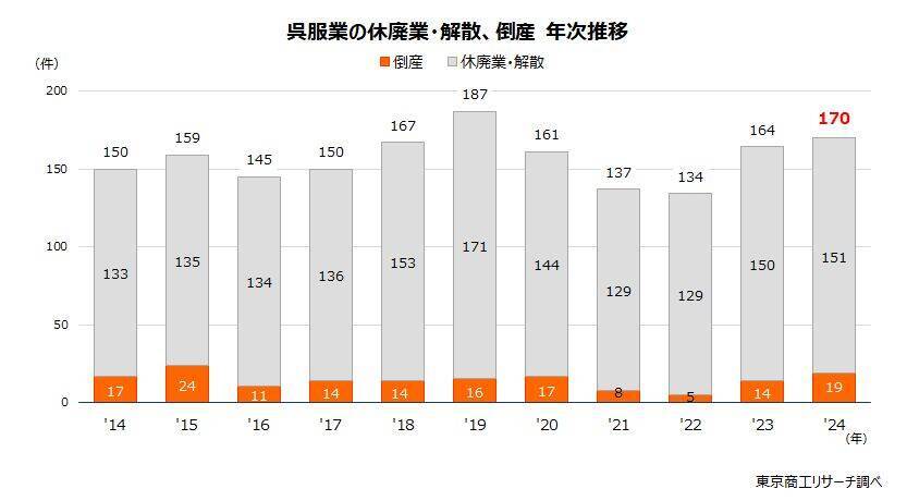 2024年の呉服業の休廃業・解散は151件(前年比0.6%増)、倒産は19件(同35.7%増)で合計170件(同3.6%増)に達した。休廃業・解散は、直近10年間で2019年の171件、2018年の153件に次いで3番目、倒産は2015年の24件に次いで2番目の高水準で、合計も2019年の187件に次ぐ2番目の高水準となった。