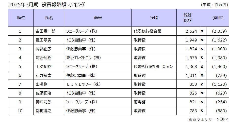 2025年3月期の役員報酬ランキングは、トップがソニーグループの吉田憲一郎代表執行役会長の25億2,400万円(前年23億3,900万円)で、歴代19番目だった。内訳は、定額報酬2億4,000万円、業績連動報酬3億9,600万円のほか、ストックオプション7億4,300万円、譲渡制限付株式ユニット(RSU)11億4,400万円など。