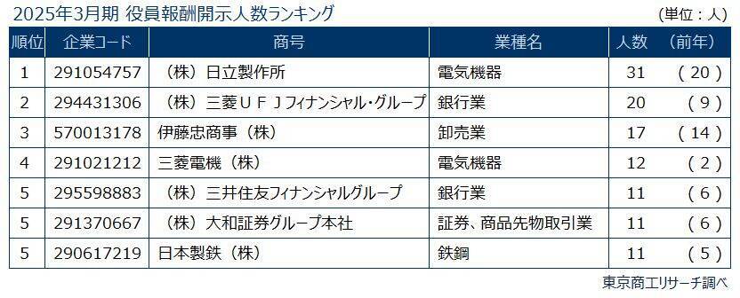 2025年3月期に報酬額1億円以上を受け取った役員の個別開示を行った343社のうち、開示人数の最多は日立製作所の31人で、前年(34人)に引き続き2年連続で30人以上だった。