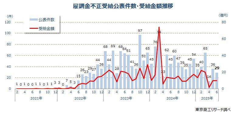 ※ 本調査は、雇用調整助成金、または緊急雇用安定助成金を不正に受給したとして、各都道府県の労働局が2025年6月30日までに公表した企業を集計、分析した。