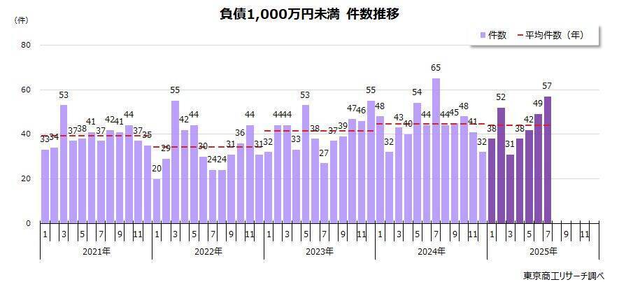 2025年7月の負債1,000万円未満の倒産は、今年最多の57件(前年同月比12.3%減)に達した。