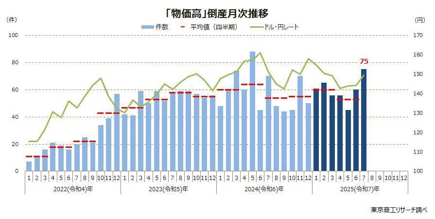 2025年7月の原材料高騰などに伴う「物価高」倒産は、今年最多の75件(前年同月比7.1%増)に達した。2022年からの円安で物価高が進行し、2024年5月の88件に次ぎ、2番目の高水準となった。