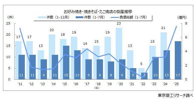 2025年1-7月のお好み焼き屋・焼きそば屋・たこ焼き屋の倒産は17件(前年同期比30.7%増)で、前年同期の1.3倍のペースで推移している。