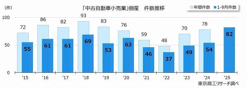 2025年1-9月の「中古自動車小売業」の倒産は82件(前年同期比51.8%増)で、前年同期の1.5倍に急増した。年間では、過去10年で最多の2018年(93件)を超えることがほぼ確実になった。