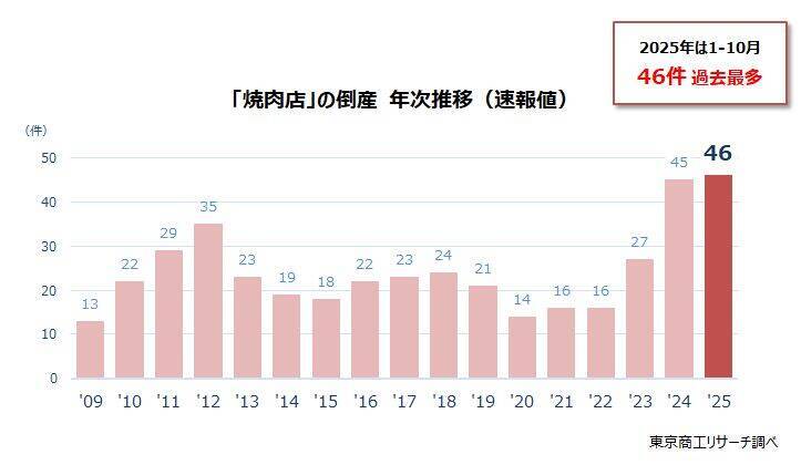 2025年(10月30日時点)の「焼肉店」の倒産(負債1,000万円以上)は46件に達し、2009年に統計を開始以降、年間最多を更新した。2024年もコスト増と新規参入組も参戦した大手チェーンとの競争激化で、倒産は2023年の27件を上回る45件に急増した。2025年に入っても、牛肉価格の高騰や光熱費、人件費の上昇が止まらず、大手安価チェーンとの競合で2年連続で倒産が最多を更新した。