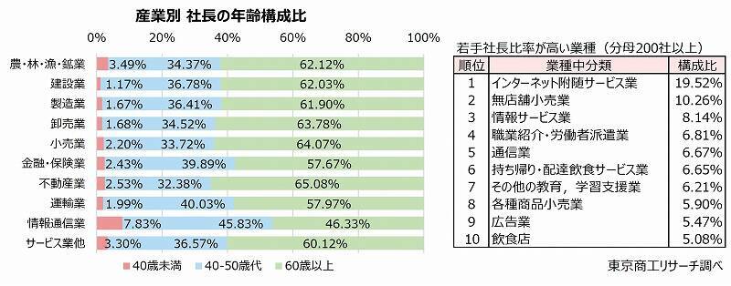 このほか、農・林・漁・鉱業3.4%、サービス業他3.3%と続き、上位3産業で「若手社長」の比率が3%を超えた。