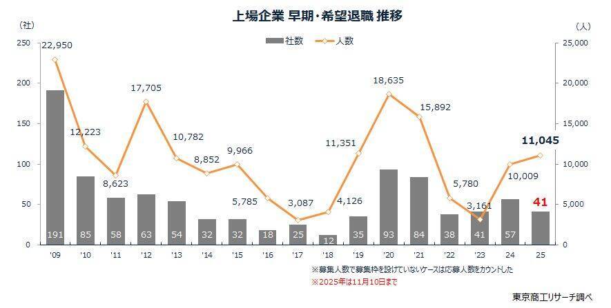 2025年1月1日-11月10日までに「早期・希望退職募集」が判明した上場企業は41社だった。