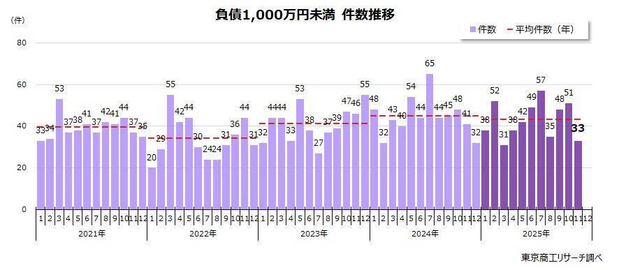 2025年11月の負債1,000万円未満の倒産は、件数が33件(前年同月比19.5%減)で、 3カ月ぶりに前年同月を下回った。2025年に入り、3月の31件に次いで2番目に少なかった。