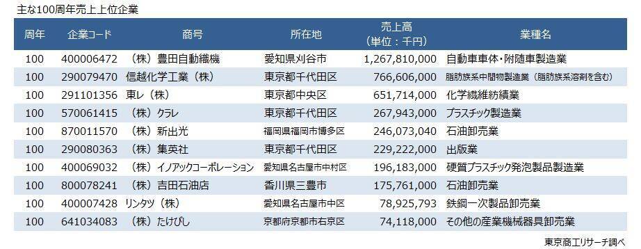 1626年創業の400周年は、千年鮭の「きっかわ」(新潟)、茶販売の「京都利休園」(滋賀)、野中烏犀圓として知られる薬問屋「ウサイエン製薬」(佐賀)、酒蔵の「林酒造」(富山)の4社。1726年創業の300周年は、医薬品卸の「中北薬品」(愛知)、酒蔵の「松井酒造」(京都)の2社。1826年創業の200周年は、酒蔵の「大門酒造」(大阪)と醤油製造の「福寿醤油」(徳島)の2社。戦後生まれの50周年(1976年創業)は2万2,305社で、リコーリースやホンダアクセス、オリックス・レンテック、三菱商事パッケージングなど。