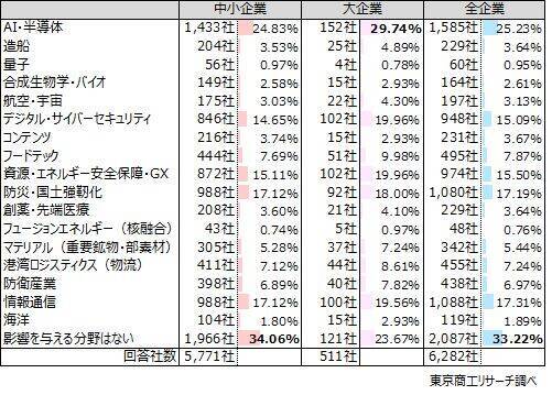 次いで、「AI・半導体」の25.2%(1,585社)、「情報通信」の17.3%(1,088社)、「防災・国土強靭化」の17.1%(1,080社)と続いた。
