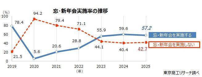 コロナ禍前の忘・新年会の実施率は78.4%だったが、コロナ禍の2020年は5.6%まで下がった。その後、2023年に55.9%まで戻したが、その後は伸び悩み、今シーズンはコロナ禍後で初めて前年を下回った。