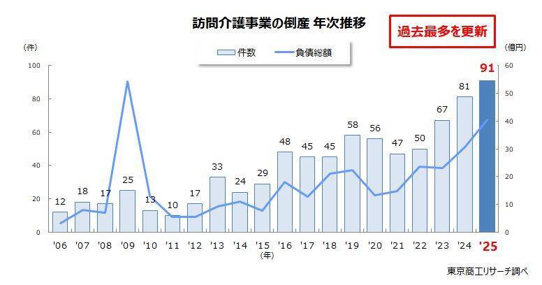 介護報酬のマイナス改定やヘルパー不足などで深刻な経営環境にある訪問介護業界の倒産が、2025年は91件(前年比12.3%増)で調査開始以来、過去最多だったことがわかった。3年連続で更新した。