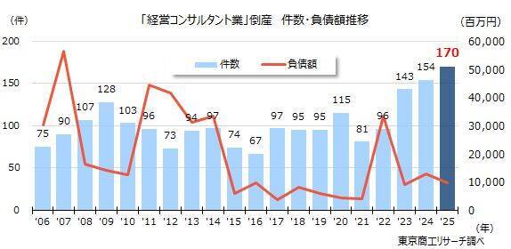 2025年の「経営コンサルタント」の倒産は、2006年以降の20年間で最多の170件(前年比10.3%増)に達した。 コロナ禍の2022年から4年連続で増加した。