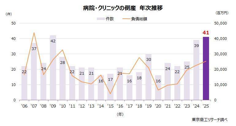 2025年の「病院・クリニック(歯科医院を除く)」倒産は41件(前年比5.1%増)で、3年連続で前年を上回った。2006年以降の20年間では、最多の2009年(42件)に迫る2番目の高水準となった。