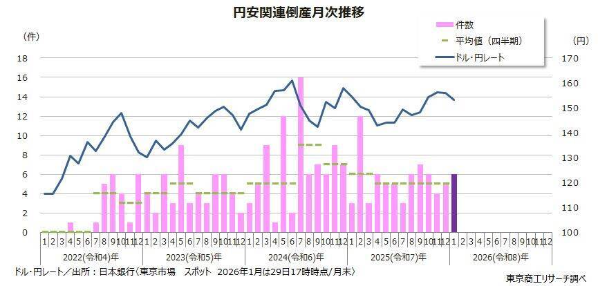 2026年1月の「円安」倒産は、6件(前年同月比100.0%増)と2倍に増加した。2022年7月から43カ月連続で発生し、1月では2017年以降の10年間で最多となった。