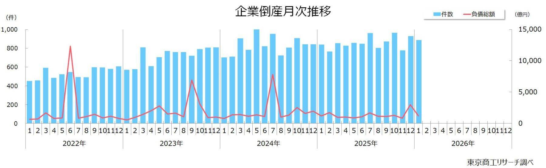 2026年1月の全国企業倒産(負債1,000万円以上)は、件数が887件(前年同月比5.5%増)、負債総額は1,198億1,500万円(同1.3%減)だった。