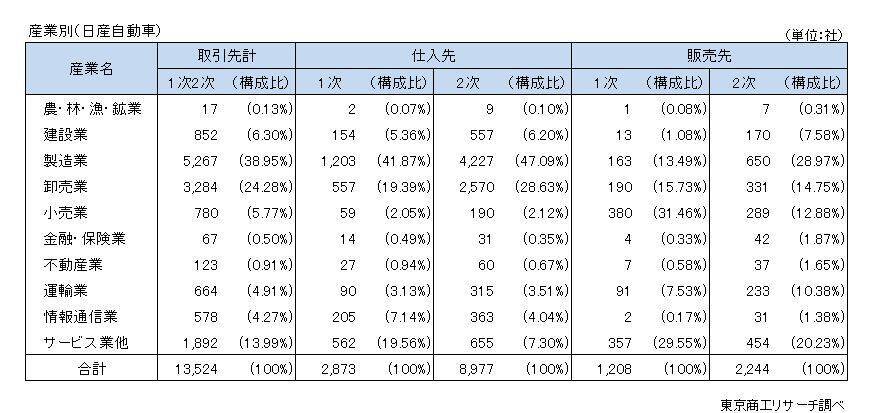 日産Gの取引先を、産業別で分析した。仕入と販売を合わせた取引先合計は、製造業が5,267社(構成比38.9%)で最多だった。製造業は前回調査の5,139社から128社増えた。次いで、原材料や生産設備の販売など卸売業が3,284社(同24.2%)、人材派遣業などサービス業他が1,892社(同13.9%)と続く。