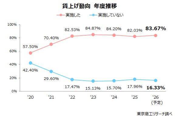 2026年度に賃上げを予定する企業は83.6%で、5年連続で80%台に乗せる見込みだ。