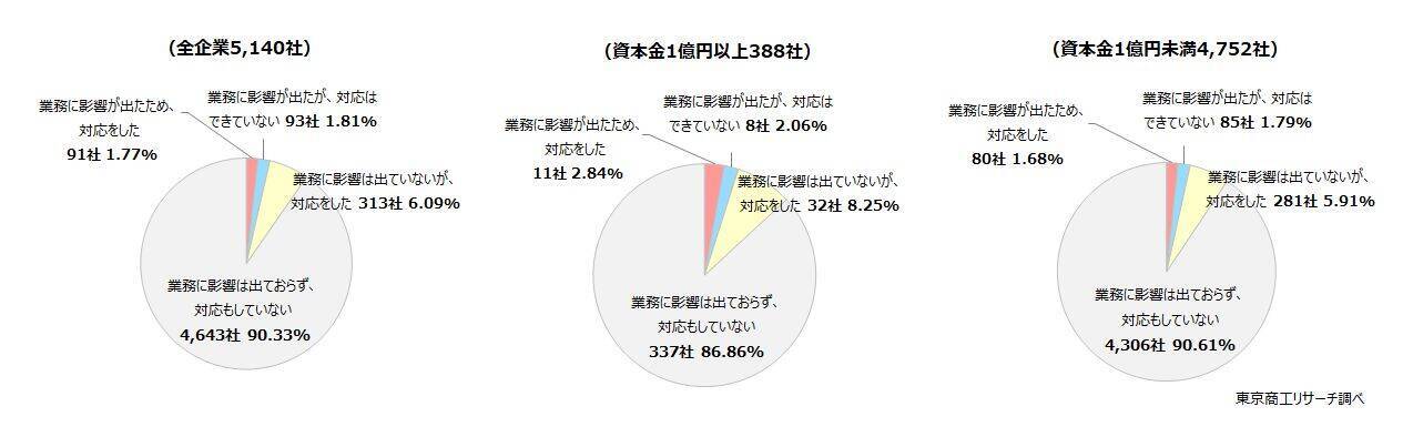 回答があった5,140社では、「業務に影響が出ておらず、対応もしていない」が9割(90.3%)に達した。