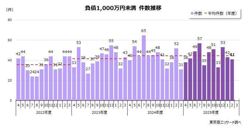 2026年2月の負債1,000万円未満の倒産は、41件(前年同月比21.1%減)と 3カ月ぶりに前年同月を下回った。2025年度(4-2月累計)は490件(前年同期比2.5%減、前年同期503件)で前年同期を下回っているが、年度では3年連続で500件台が確実になった。