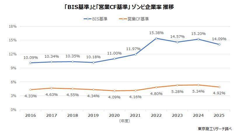 分析では、2024年度のゾンビ企業率(BIS基準)は15.20%で、前年度より0.63ポイント悪化した。2016年度以降の10年間(2015年度は10.40%)では、コロナ禍の2022年度(15.38%)に次ぐ深刻な状況だった。