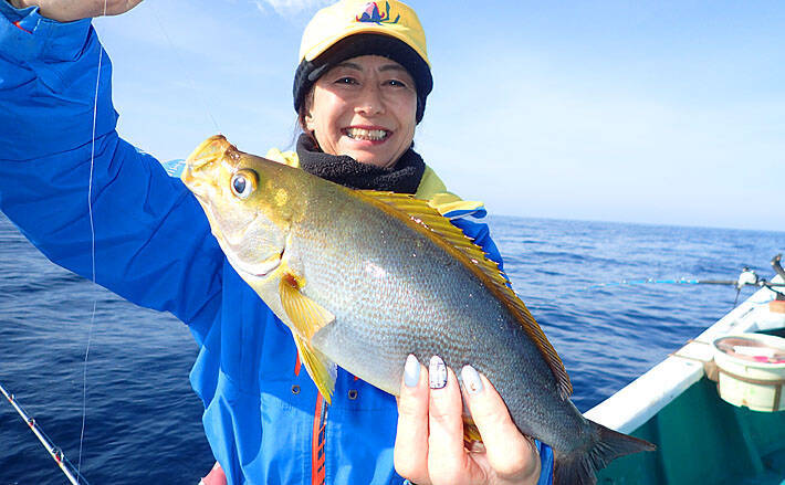 ポイントは天然の岩礁帯が主で、その起伏など変化のある場所に集まる魚を探す。反応があればその潮上から船を流すのだが、ここで重要なのがタナ設定。この釣りでは、船長のアナウンスできっちりと正確に仕掛けのタナを設定する。