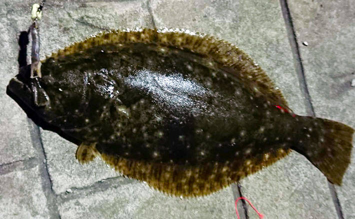 途中の引き込みをかわし、水面に浮かんできた魚体を確認すると、ドラゴンタチウオではなくヒラメだ!友人に手伝ってもらい無事ランディング。50cmはないが身に厚さのある美味しそうなヒラメだ。家で計測を行うと47cmだった。