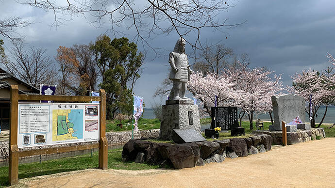 湖岸駐車場を備える坂本城址公園。NHK大河ドラマ「麒麟がくる」の主人公、明智光秀が築いたといわれる坂本城。現在、観光客の方々で駐車場はほぼ満車。坂本城址公園から500m南へ下った四ッ谷湖岸緑地駐車場の利用がオススメ。