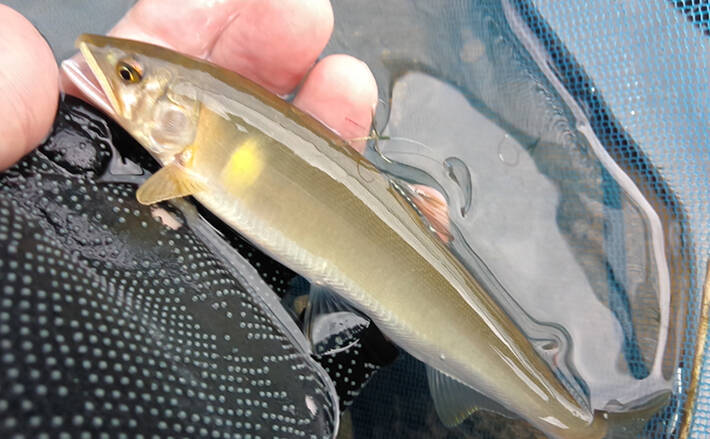 7~12cmの天然遡上稚アユが穂先を優しく刺激するようにハリ掛かりすると、何とも言えない緊張感のスリリングなやり取りが楽しめるだろう。