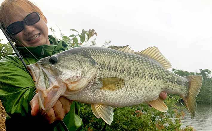 少し経ってからポイントに入り直し、再び一投目でヒット。群れの1尾がアタックしてきて、その時に動いたルアーに同じ群れの他のバスが食ってきた。上がってきたのは、40cmほどのバス。