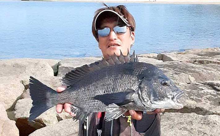 そこから30分ほどは、再び何もない状態。少しだが潮が沖に出ていきだしたタイミングで、前アタリから続いて、ゆっくりとウキが消えていく。アワセも決まり、チヌの竿を叩くような引きが伝わってきた。慎重にやり取りし、無事タモに収めたのは、40cm級のチヌだ。