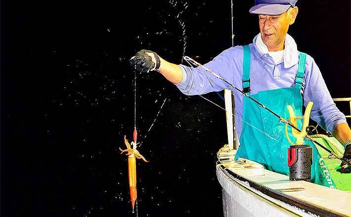 海面下10mくらいまで1m刻みに探っていくと、体力的にも無理がなく効率的。竿先を海面まで下げ、そこから目線辺りまでゆっくり聞き上げて止める。イカが乗ったらそこが当たりダナ。その水深を覚えておき、次投からはその付近で集中的に誘いをかける。