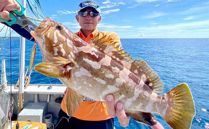 中層でおとなしくなったが、慎重に浮かせると茶色い魚体だ。良いサイズのオオモンハタと思ったが、縞模様のいかつい顔。クエだ。ネットに収めてガッツポーズ。
